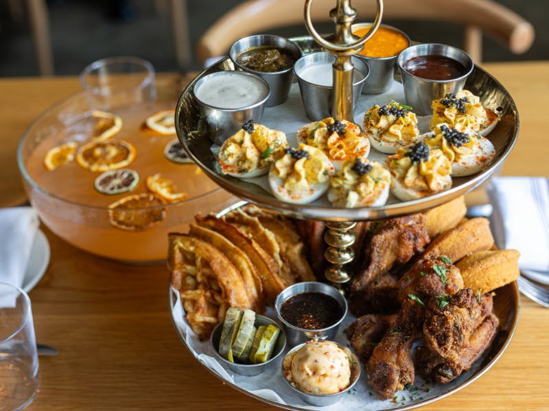 NEW! Dive into the Golden Bird Tower featuring our crispy fried chicken and waffles, deviled eggs, cornbread, and caviar. Pair it with the Dey Know Punch Bowl, a house-made rum punch perfect for summer!
